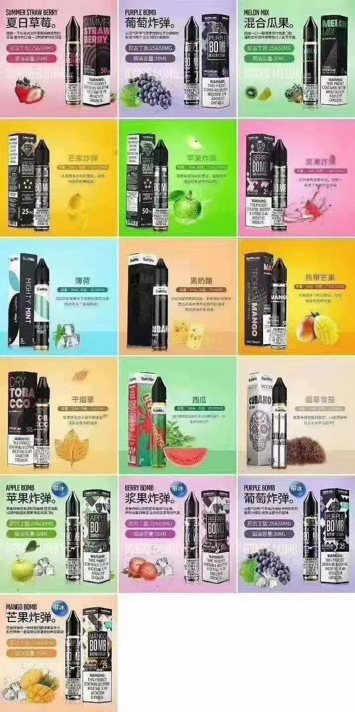Dry Tobacco幹煙草25mg, Dry Tobacco幹煙草50mg, Cubano Silver雪茄25mg, Cubano Silver雪茄50mg, Cubano奶酪煙草25mg, Cubano奶酪煙草50mg, Cubano Black黑奶酪25mg, Cubano Black黑奶酪50mg, Berry Bomb莓果炸彈25mg, Berry Bomb莓果炸彈50mg, Mango Bomb芒果炸彈25mg, Mango Bomb芒果炸彈50mg, Apple Bomb蘋果炸彈25mg, Apple Bomb蘋果炸彈50mg, Might Mint薄荷25mg, Might Mint50mg, Purple Bomb紫色炸彈25mg, Purple Bomb紫色炸彈50mg, Ice Berry Bomb冰莓果炸彈25mg, Ice Berry Bomb冰莓果炸彈50mg, Ice Mango Bomb冰芒果炸彈25mg, Ice Mango Bomb冰芒果炸彈50mg, Ice Apple Bomb冰蘋果炸彈25mg, Ice Apple Bomb冰蘋果炸彈50mg, Ice Purple Bomb冰紫色炸彈25mg, Ice Purple Bomb冰紫色炸彈50mg